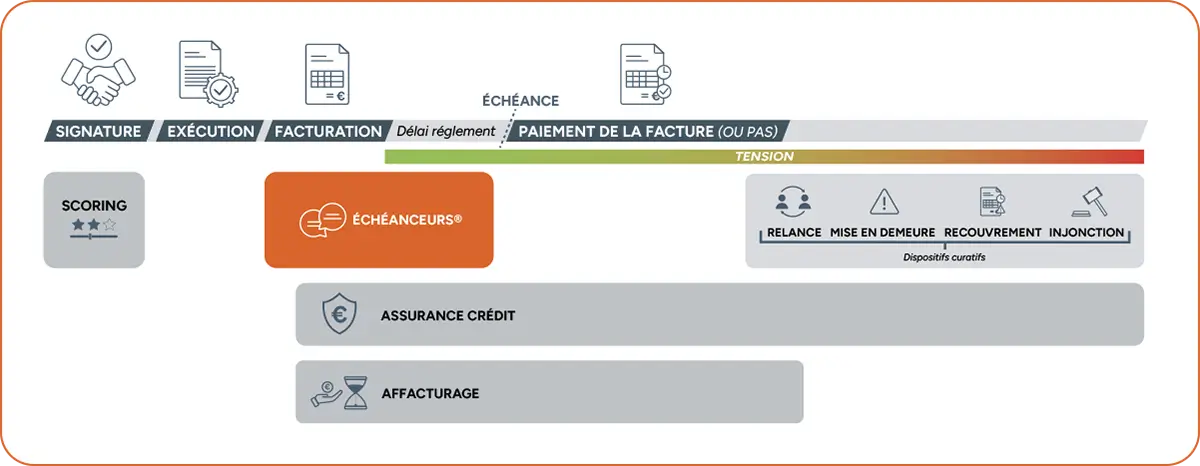 Certes il existe des dispositifs curatifs - relances, mise en demeure, recouvrement, injonction, démarches juridiques - et des solutions de couverture du risque ou de l'encours - assurance ou affacturage - mais chez CFC Solutions nous préférons agir en amont des tensions, durant la période d'échéance pour prolonger votre relation client avec les équipes comptables de vos clients. C'est en prenant soin des interlocuteurs et de vos finances que nous participons à maintenir les entreprises que nous accompagnons en bonne santé.